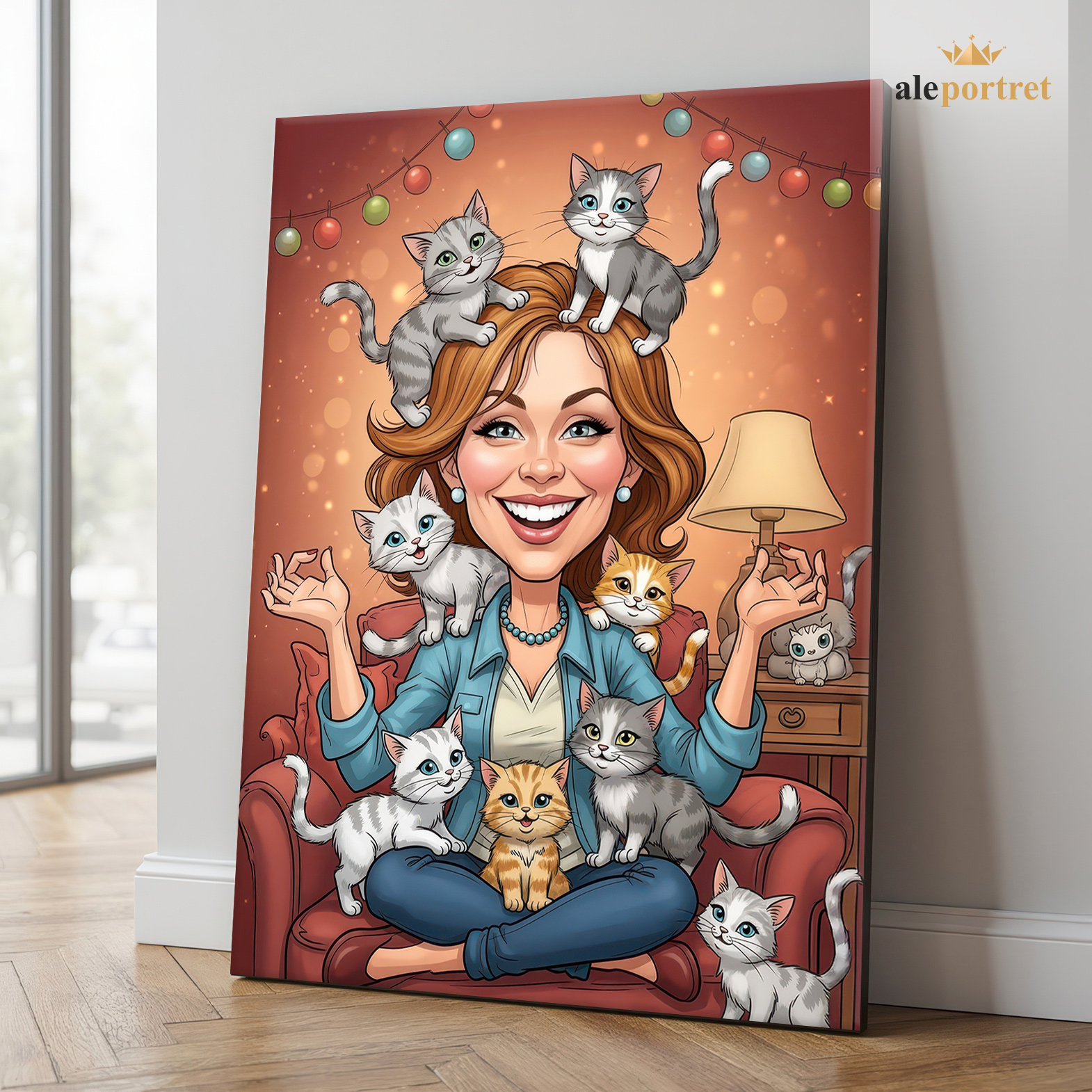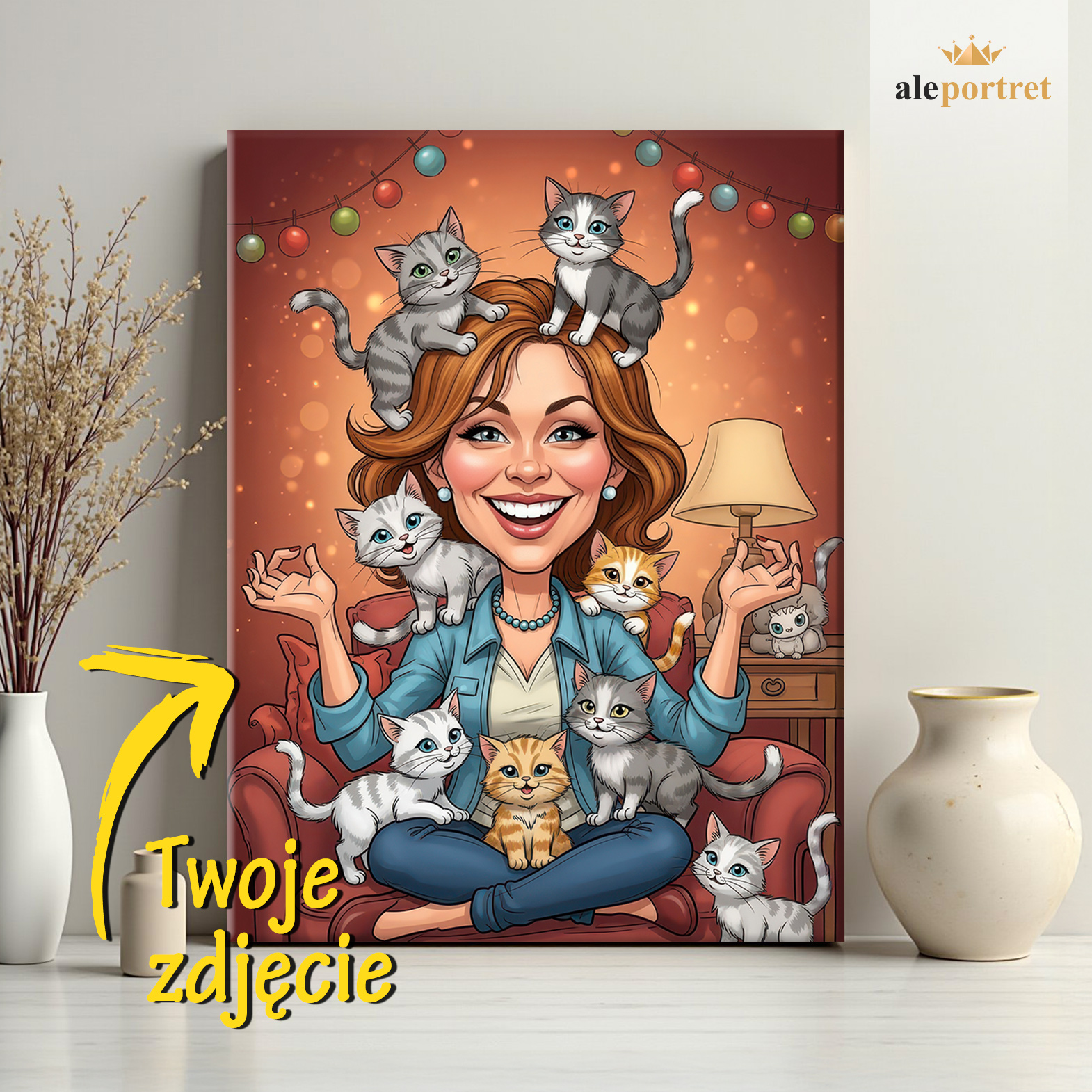 Karykatura z Twojego zdjęcia. Stwórz unikalny portret jako zabawny prezent dla miłośniczki kotów na każdą okazję. Wysoka jakość wydruku zapewni estetyczne uzupełnienie wnętrza. Wyjątkowy prezent, który z pewnością zostanie doceniony.